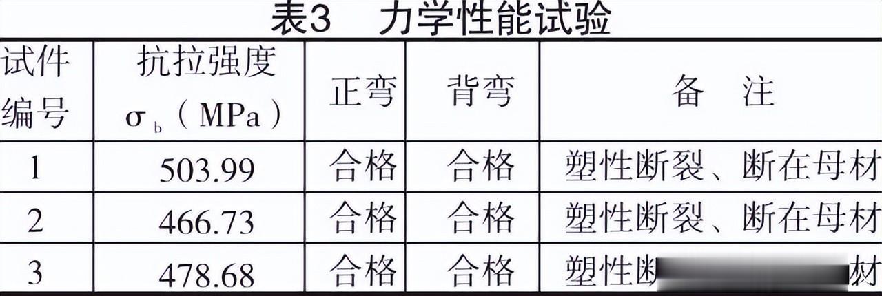 管试件焊接完毕后先进行X射线探伤,全部I级合格,其它实验采用宏观金相、微观金像检验及机械性能检验,分别如图3、图4、图5、图6、表3所示。图3、图4中清晰看到三层焊道层次形貌,组织结构变化,焊缝热影响区较小,无气孔、裂纹缺陷。表3中发现焊缝均断裂在母材区,正弯、背弯达到GB/T14452-93标准要求。从表4可以看出,得出如下结论: