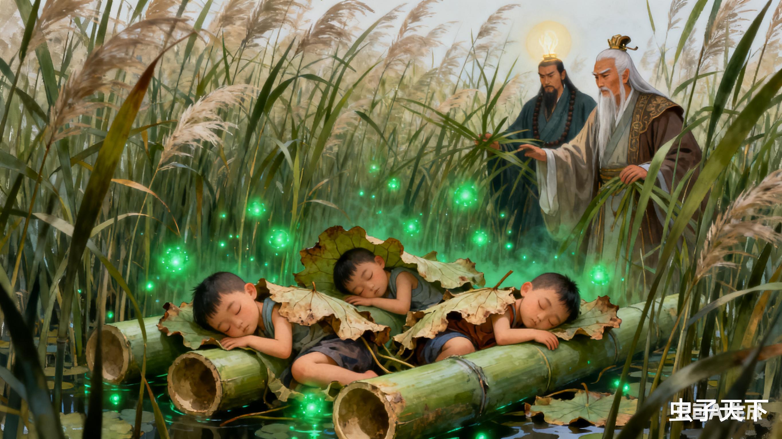 他拨开芦苇,竟见三个娃蜷在里面,睡得正香,身上还盖着几片晒干的荷叶。