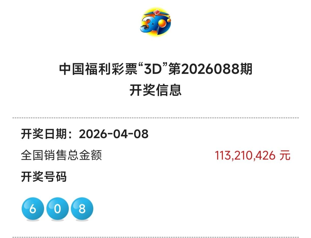 开奖快讯福彩3D26088期开奖号码为:0 6 8