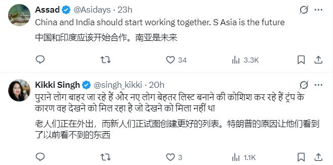 而不少印度人,已经开始畅想未来的世界格局:“当中国和印度联手时,你就知道事情要变得火爆了”。还有人表示:“老人们正在外出,而新人们正试图创建更好的道路。特朗普的原因,让他们看到以前看不到的东西”。