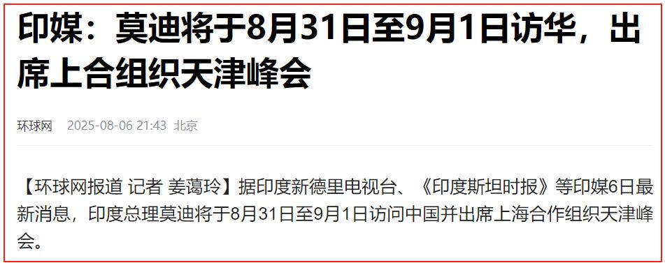 环球网:《印媒:莫迪将于8月31日至9月1日访华,出席上合组织天津峰会》
