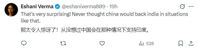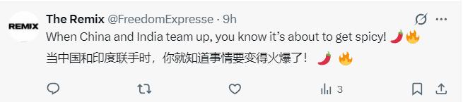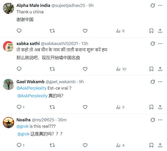 关于讨论此事的帖子下面,有大量印度网民进行评论,有人表示“谢谢中国”,还有很多印度人一个劲地问该平台的人工智能GROK——这个消息是真的吗?似乎印度人无法相信,中国会声援印度。