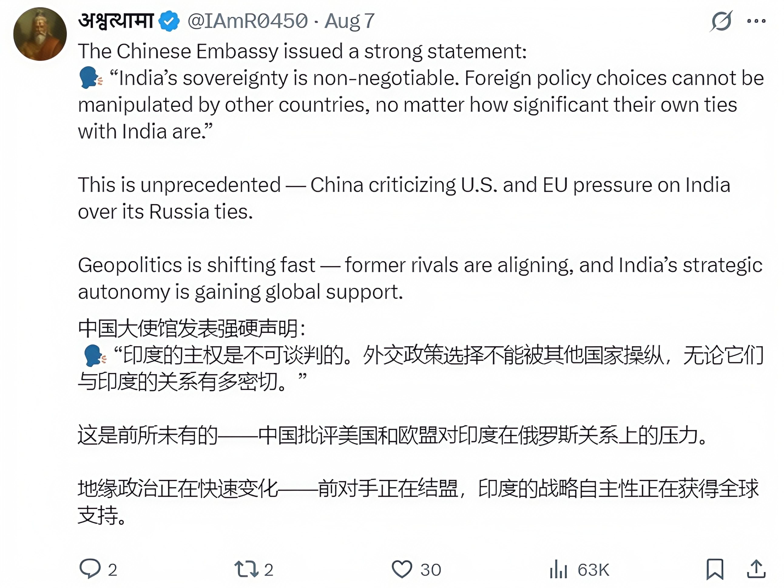 《今日商业》的评论文章更是指出,“中国作为全球最大的制造业国家和印度的重要贸易伙伴,其立场直接影响国际舆论对印度的认知。”