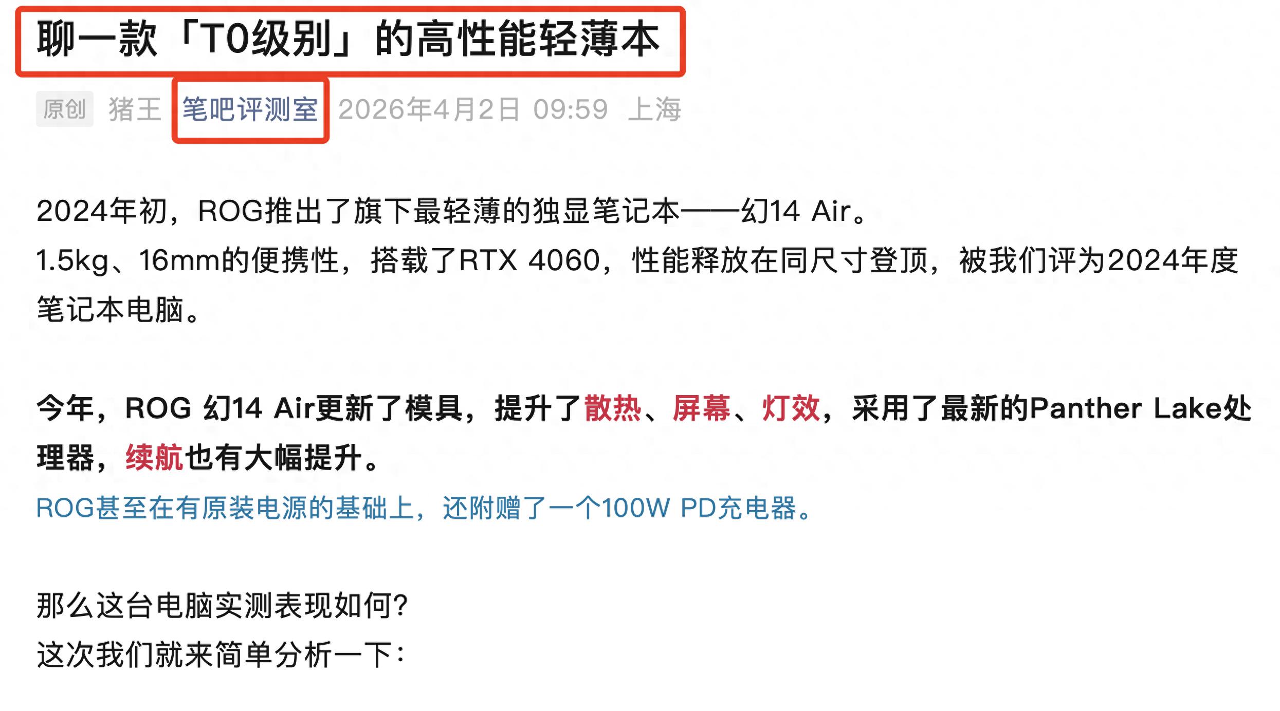 4月2日,笔吧评测室发布了对ROG幻14 Air 2026的深度评测,标题直接将其定义为「T0级别」的高性能轻薄本,吸引了大家的关注。