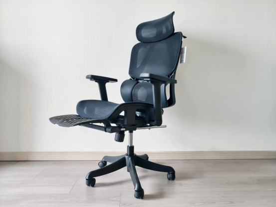 舒适性上,它采用大面积低弹透气网布,支撑感强且不易塌陷,长时间使用也能保持良好形态。坐垫前端做了弧形优化,减轻了对大腿的压迫。同时,它的调节功能非常全面:6D头枕可多向调节以匹配颈椎曲线;4D扶手适应不同手臂姿势;坐垫深度、椅背后仰角度及回弹力度均可调,能适配广泛人群。