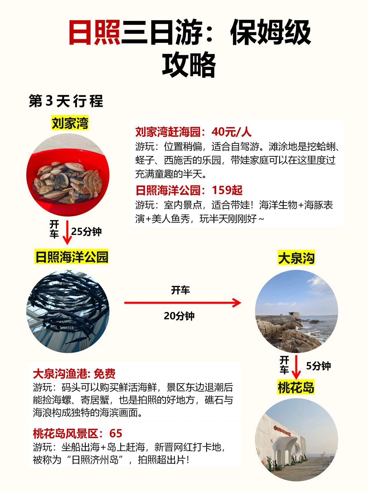 先到刘家湾赶海园(40元/人),滩涂挖蛤蜊、蛏子;开车25分钟到日照海洋公园(159+),室内看海洋生物和表演;开车20分钟到大泉沟渔港(免费),码头买海鲜,东边捡海螺、寄居蟹;再开车5分钟到桃花岛风景区(65元),坐船上岛赶海拍照