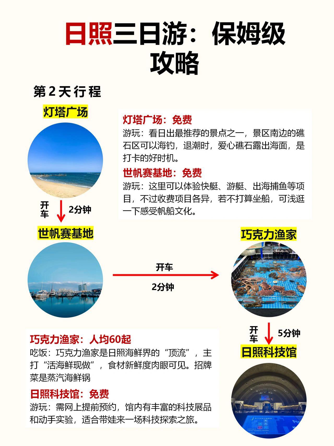 先到灯塔广场(免费)看日出,南边礁石区海钓,退潮时打卡爱心礁石;开车2分钟到世帆赛基地(免费),坐快艇、游艇、出海捕鱼(收费项目慎选);开车5分钟到巧克力渔家(人均60+)吃饭,推荐大象国际店;之后去日照科技馆(免费),提前预约,带娃学科技做实验。
