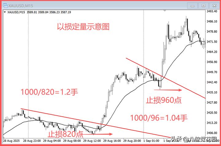 左侧底部行情上破下降趋势线,进场止损的空间是820个点,止损金额1000÷820=1.2手开仓。