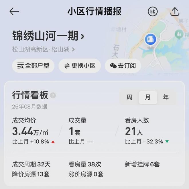 8月份,锦绣山河一期成交均价约3.44万/平,环比上涨了10.8%。