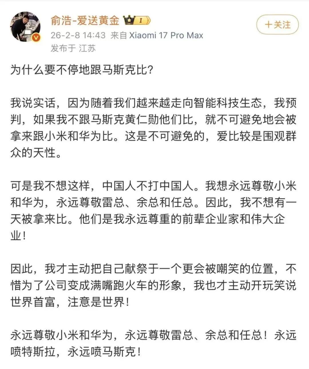 “可是我不想这样,中国人不打中国人。永远尊敬小米和华为,永远尊敬雷总、余总和任总!永远喷特斯拉,永远喷马斯克!”