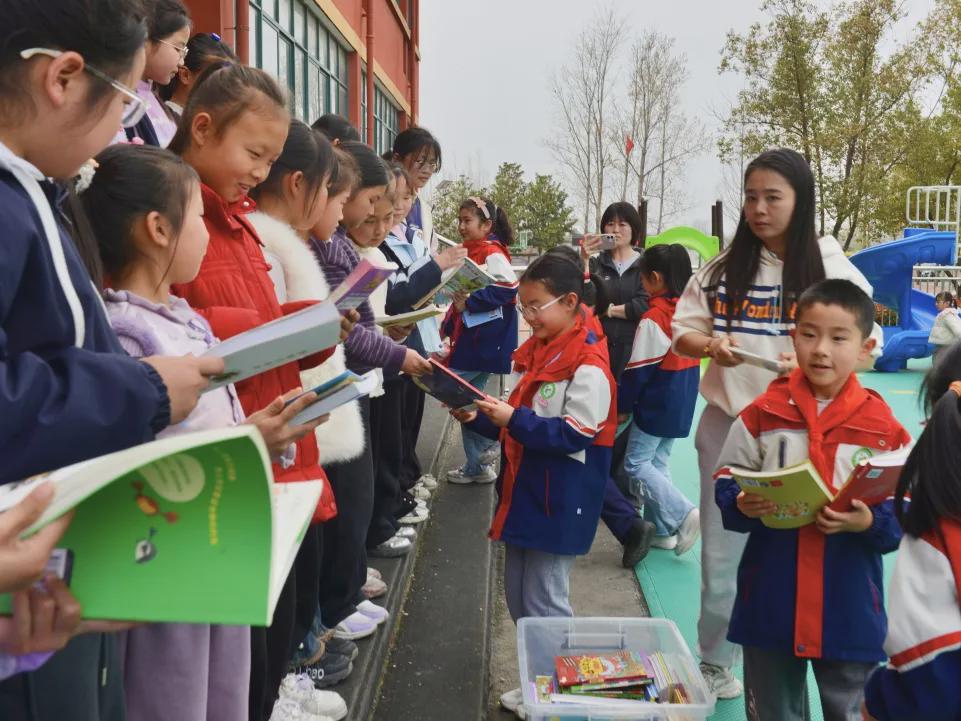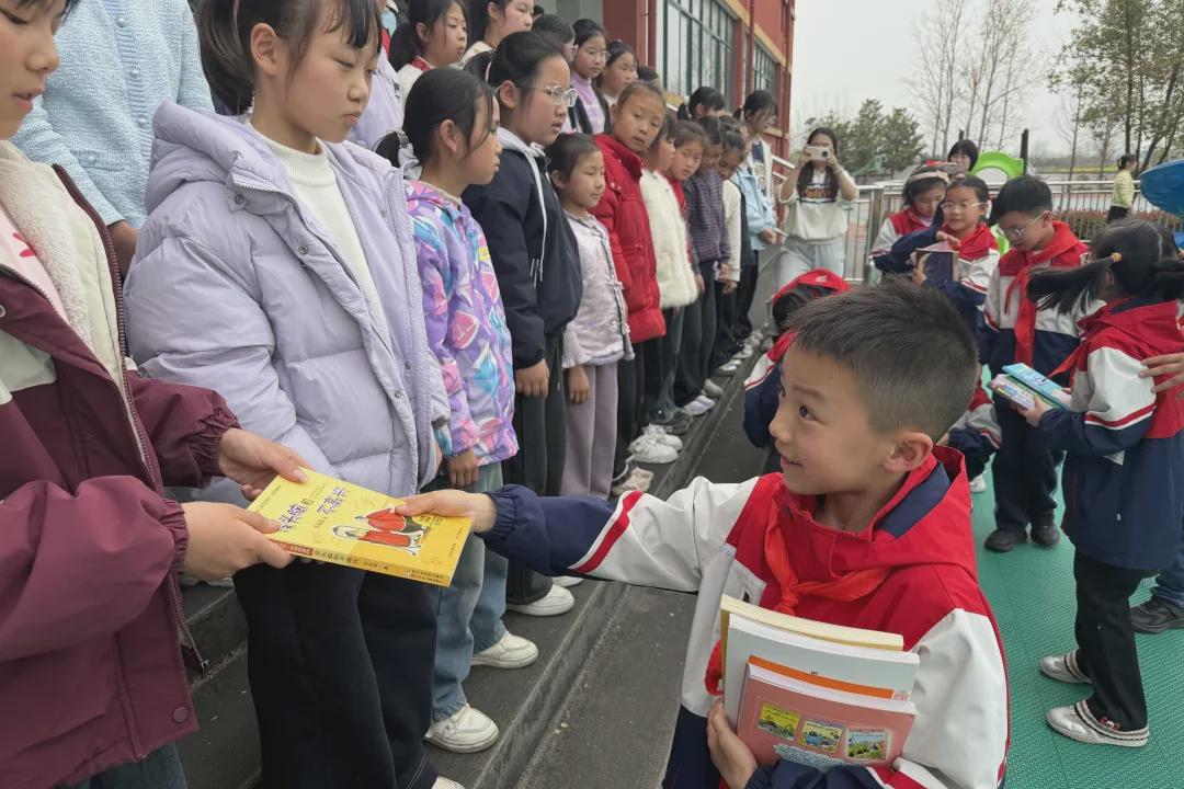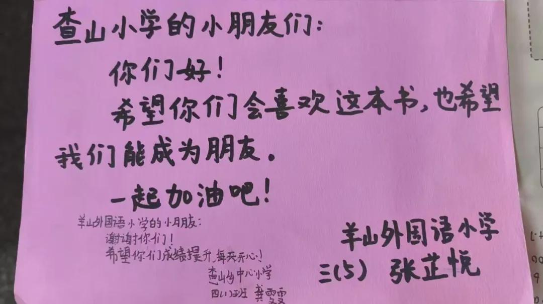 信阳市羊山外国语小学将三(5)班和一(1)班全体学生亲笔写下寄语的爱心图书郑重交到查山乡中心小学学生手中,每一本书的扉页都写满了外小学子的真诚祝福与美好期许。捐赠仪式后,全体参与人员合影留念,用镜头记录下这一温暖而有意义的时刻。