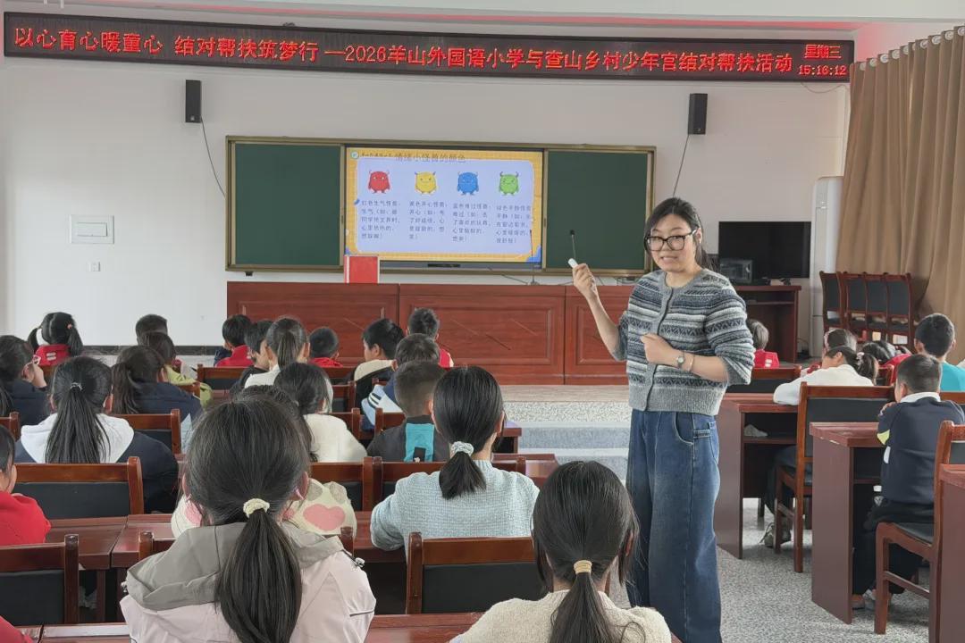 为了促进校际教育资源共享与交流合作,传递德育、心育与人文关怀,2026年3月25日,信阳市羊山外国语小学组织心辅中心老师、三(5)班师生及家长代表一行12人,赴平桥区查山乡村少年宫开展结对帮扶活动。