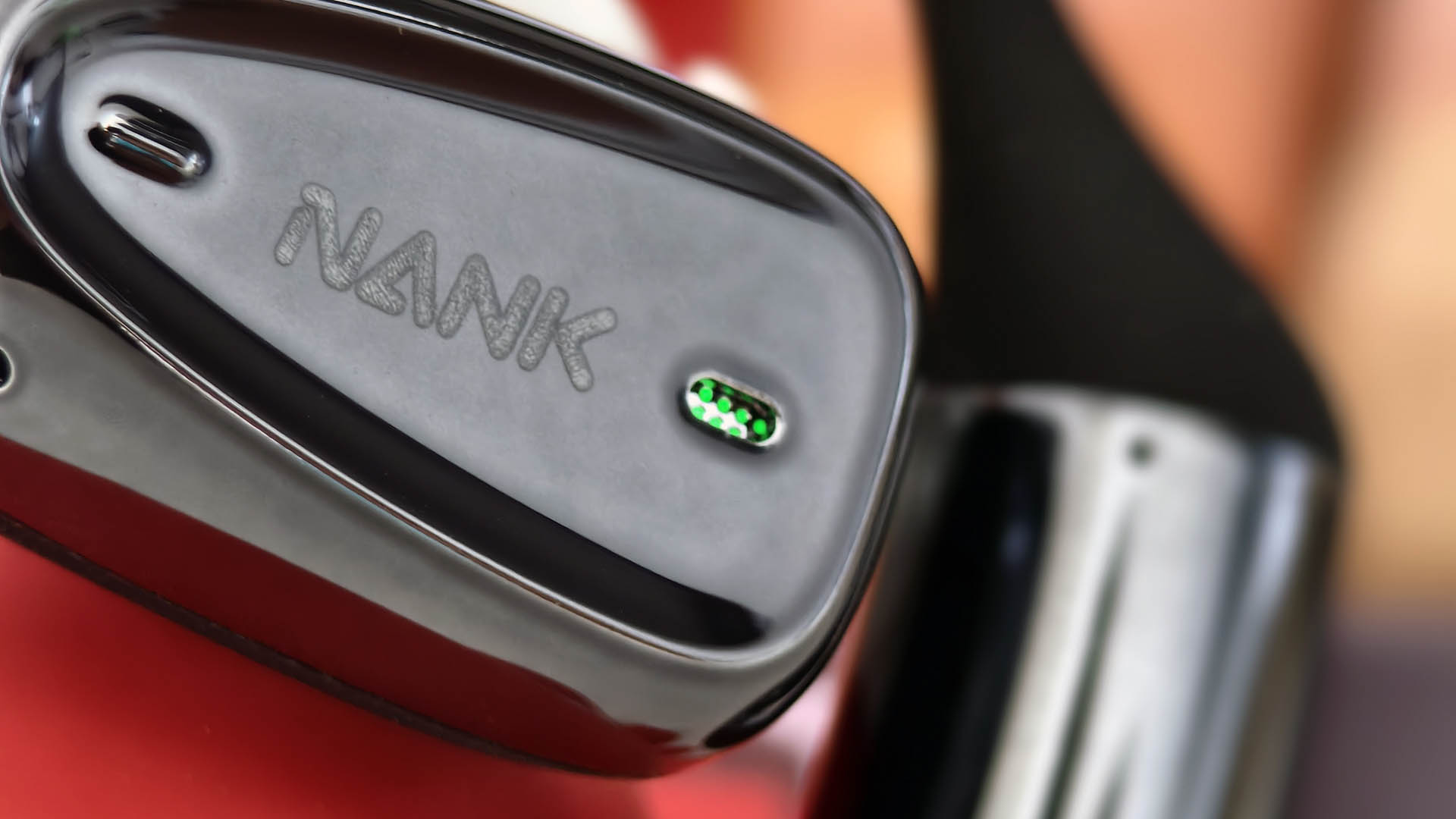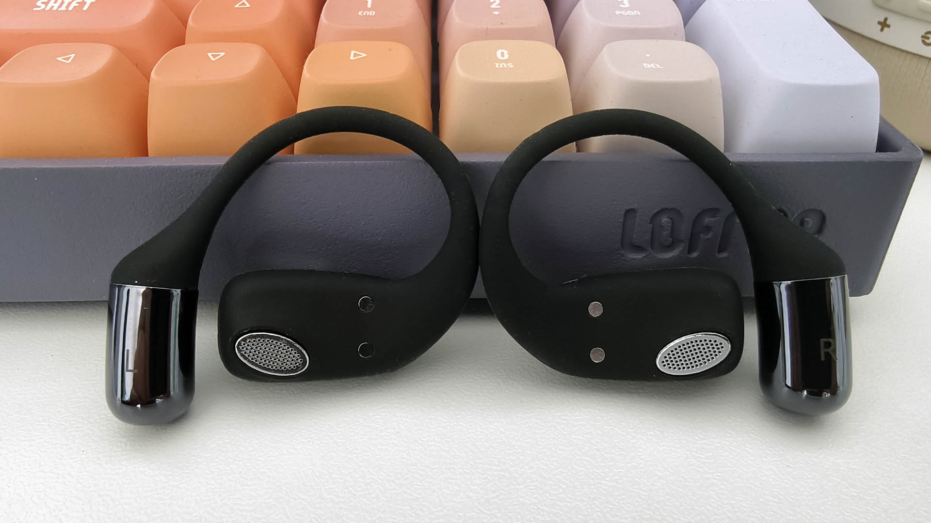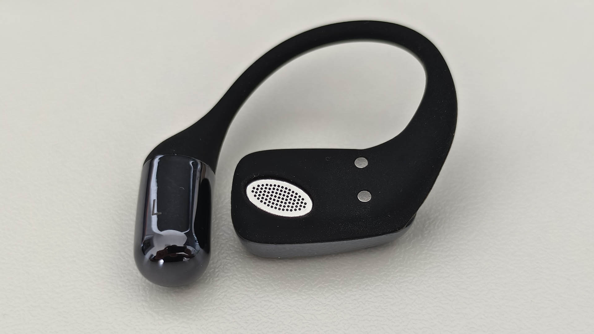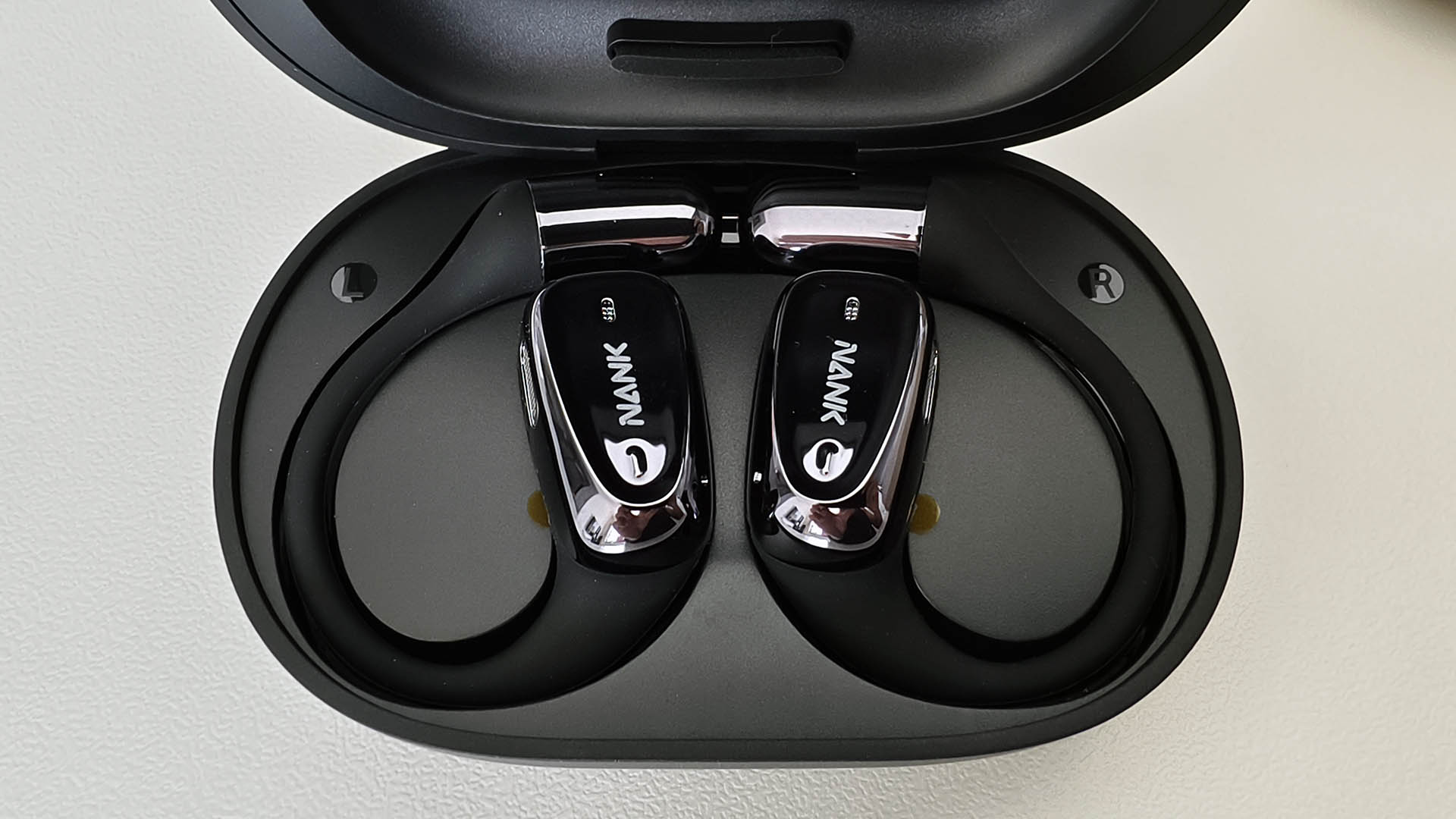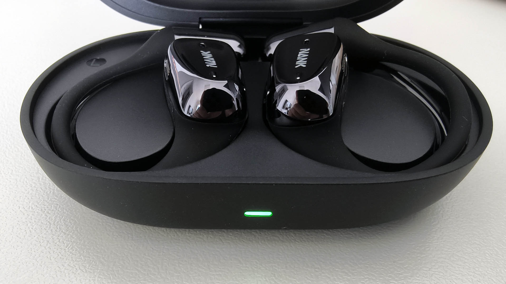 背面可以清楚的看到耳机的发音腔,充电触点还有在耳机柄上左右耳的标识,在耳机的正面则分布着耳机的麦克风,品牌LOGO,以及耳机的LED指示灯。