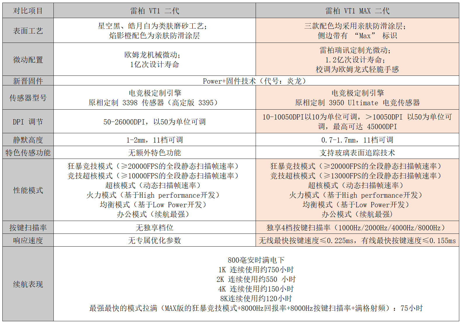 除了鼠标左下角MAX标志差异外,配置差异如下,果然还是雷柏VT1MAX二代更强大。