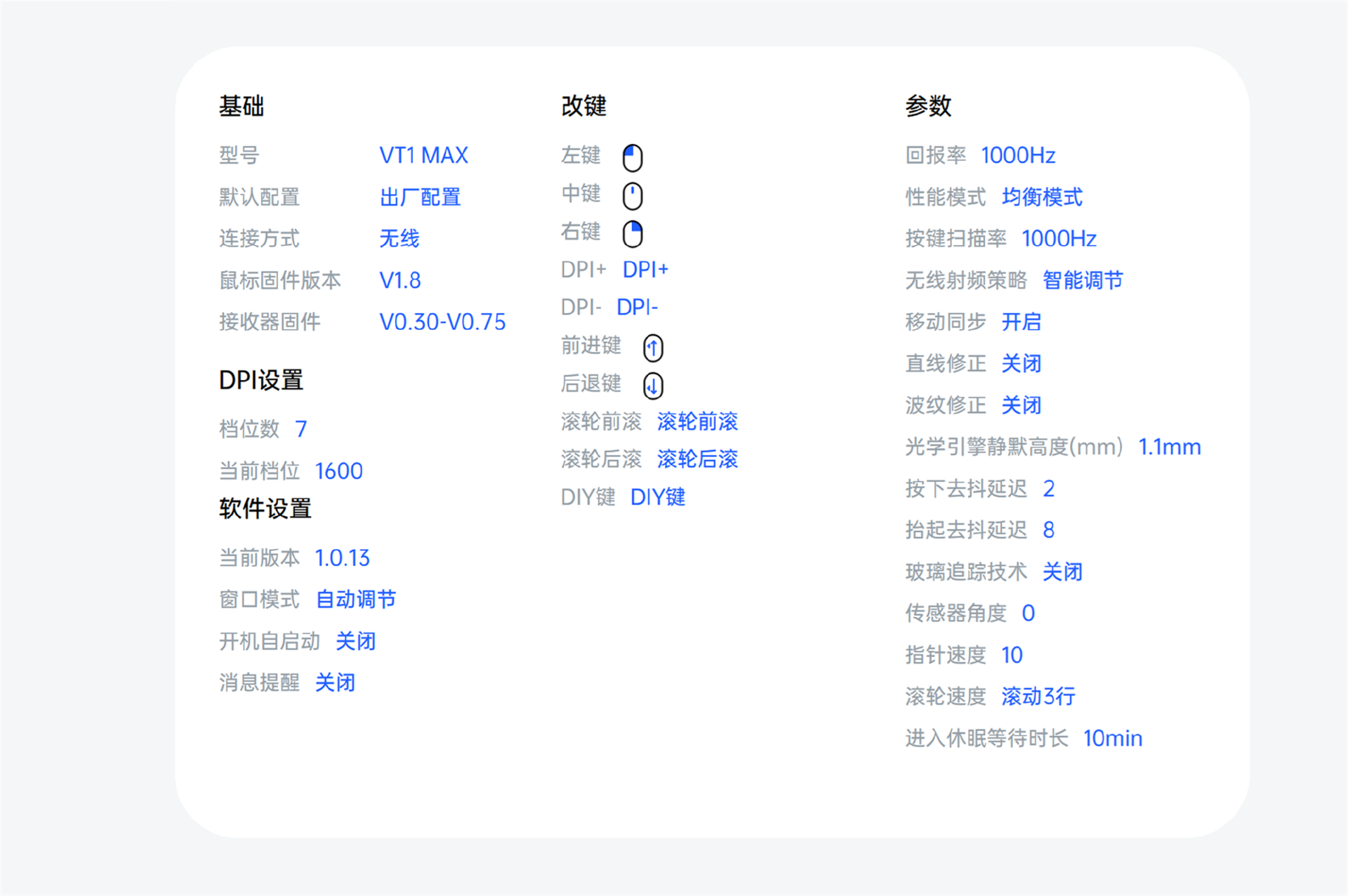 VT1MAX开放了独享4档按键扫描率,1000Hz/2000Hz/4000Hz/8000Hz,≤0.225ms无线最快按键速度,≤0.155ms有线最快按键速度。VT1还加入了本来只有MAX版拥有的狂暴竞技模式,拥有市面上续航最强的超20000FPS全段扫描帧速率,加上高回报率,电竞强跟手感。800mAh锂电池下,鼠标在1K模式下,续航由原本500小时上升到惊人的750小时,此外VT1系列还加入了按键抬起、按下消抖延迟开放0-32ms可调。