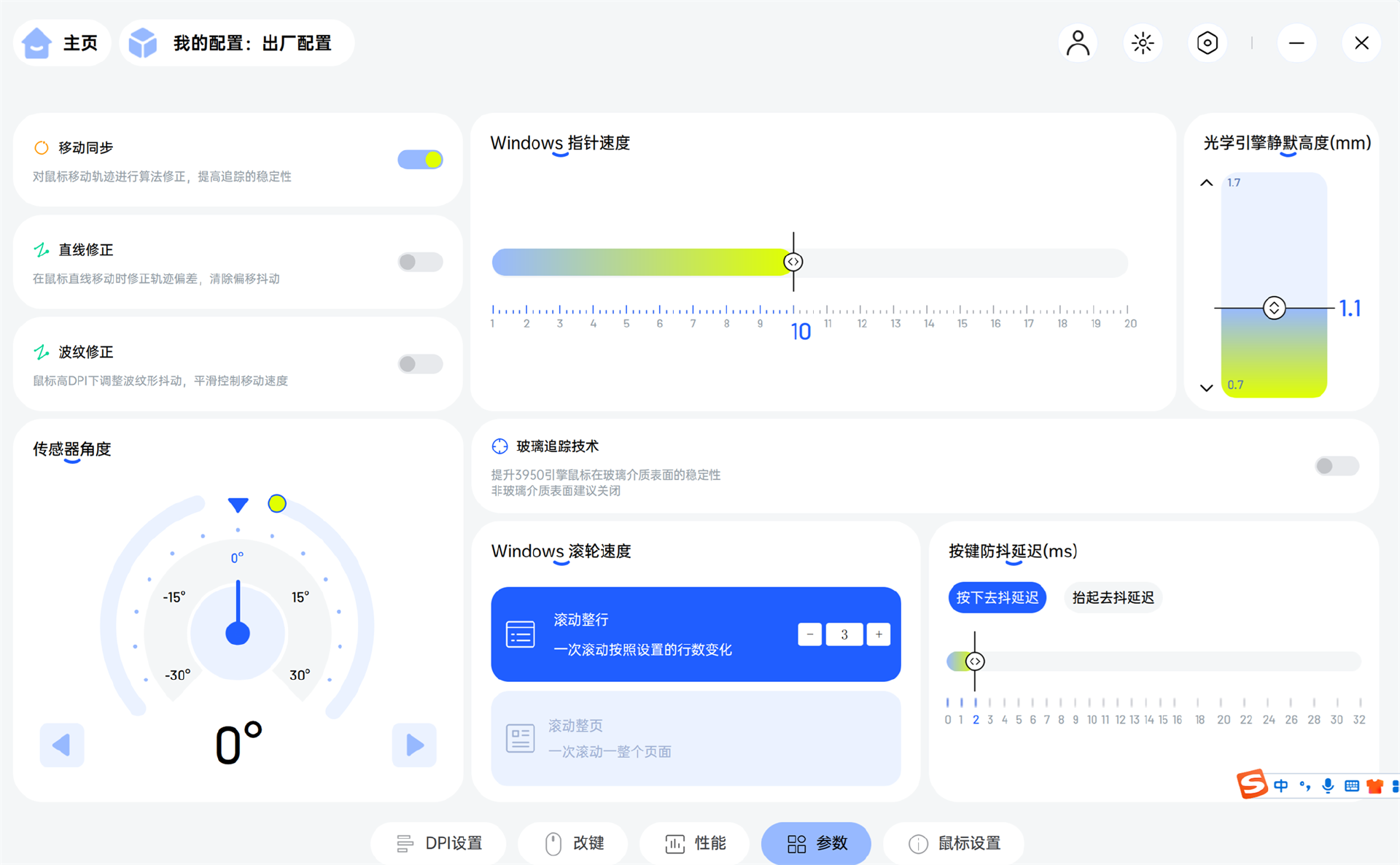 参数栏可设置移动同步、直线修正、波纹修正、Windows 指针速度、传感器角度等详细参数。若使用玻璃鼠标垫,开启玻璃追踪技术,既能获得舒适手感,还能带来出色的操作体验。