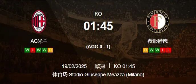 周二003欧冠16强附加赛次回合[欧13]AC米兰VS费耶诺德[欧19]时间:2月19日 01:45AC米兰今日来到欧战