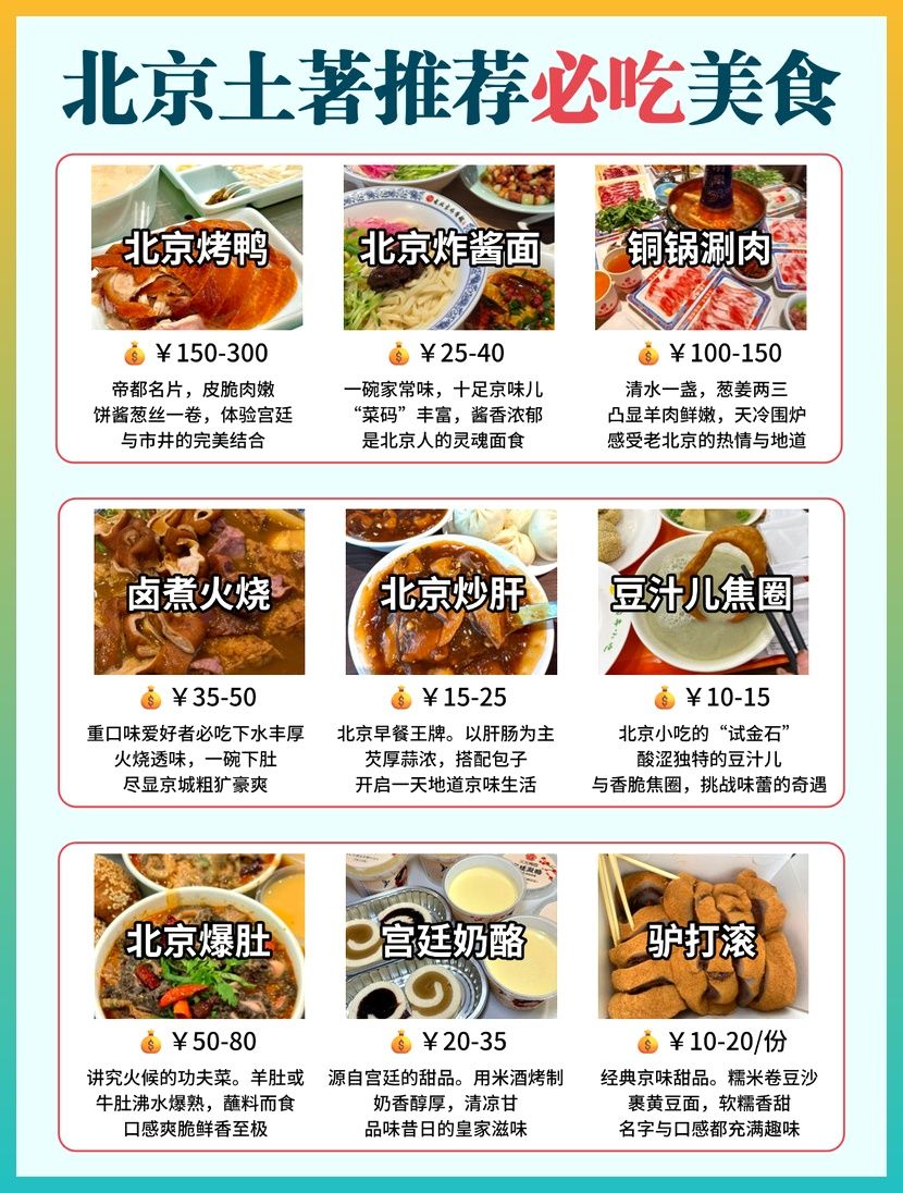 北京烤鸭(200r起):全聚德、便宜坊,随便一家都行。鸭皮脆、酱香浓,卷饼一口下去,幸福感爆棚。