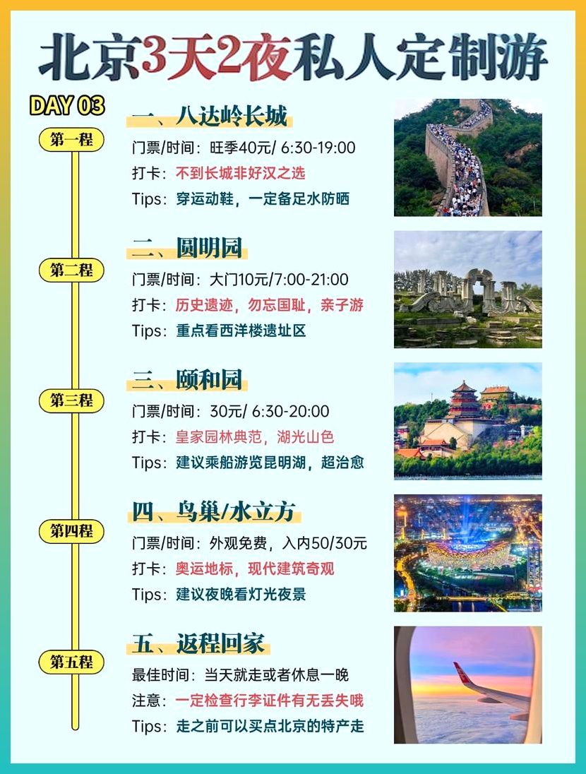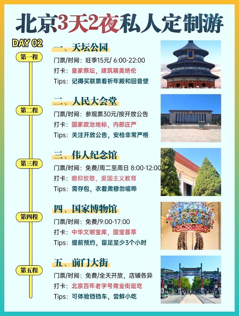 ✅ 门票提前网上订,尤其是故宫、长城,不然现场排队能崩溃。