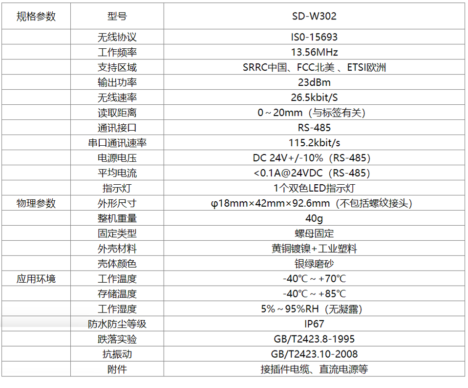 SD-W302读写器是一款弯头一体式的高频RFID读写设备。其工作频率为13.56MHz,符合IS0-15693标准,支持RS-485(Modbus RTU)通信方式。采用坚固的工程塑料,防护级别达到IP67。读写器具有识别速度快、准确率高、安装方便等特点。