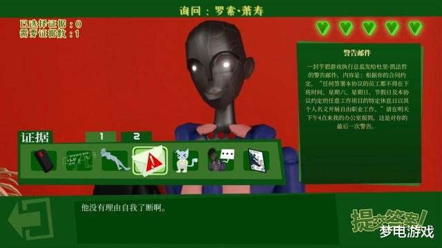 本作在交互方面表现良好,例如,游戏精准模拟了犯罪嫌疑人从闭口不谈到配合调查的心理转变过程。通过提问挖掘其言辞中的矛盾,逐步击溃其心理防线,最终促成供述。但此时,嫌疑人口中的话未必全是事实,我们还需根据游戏中获取的线索进行核实。