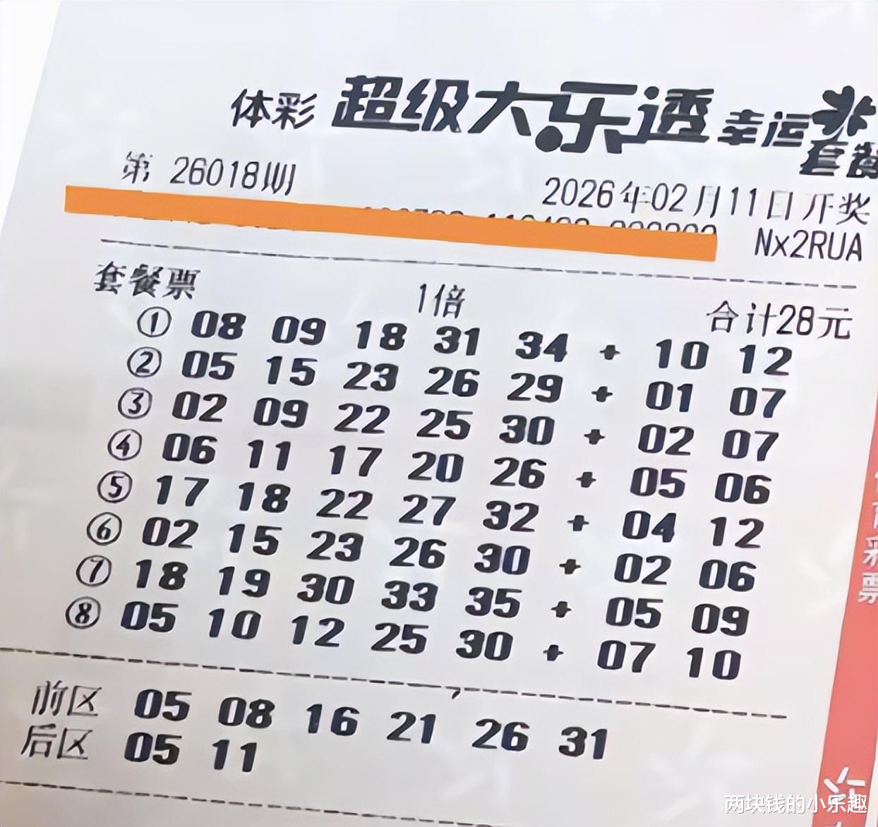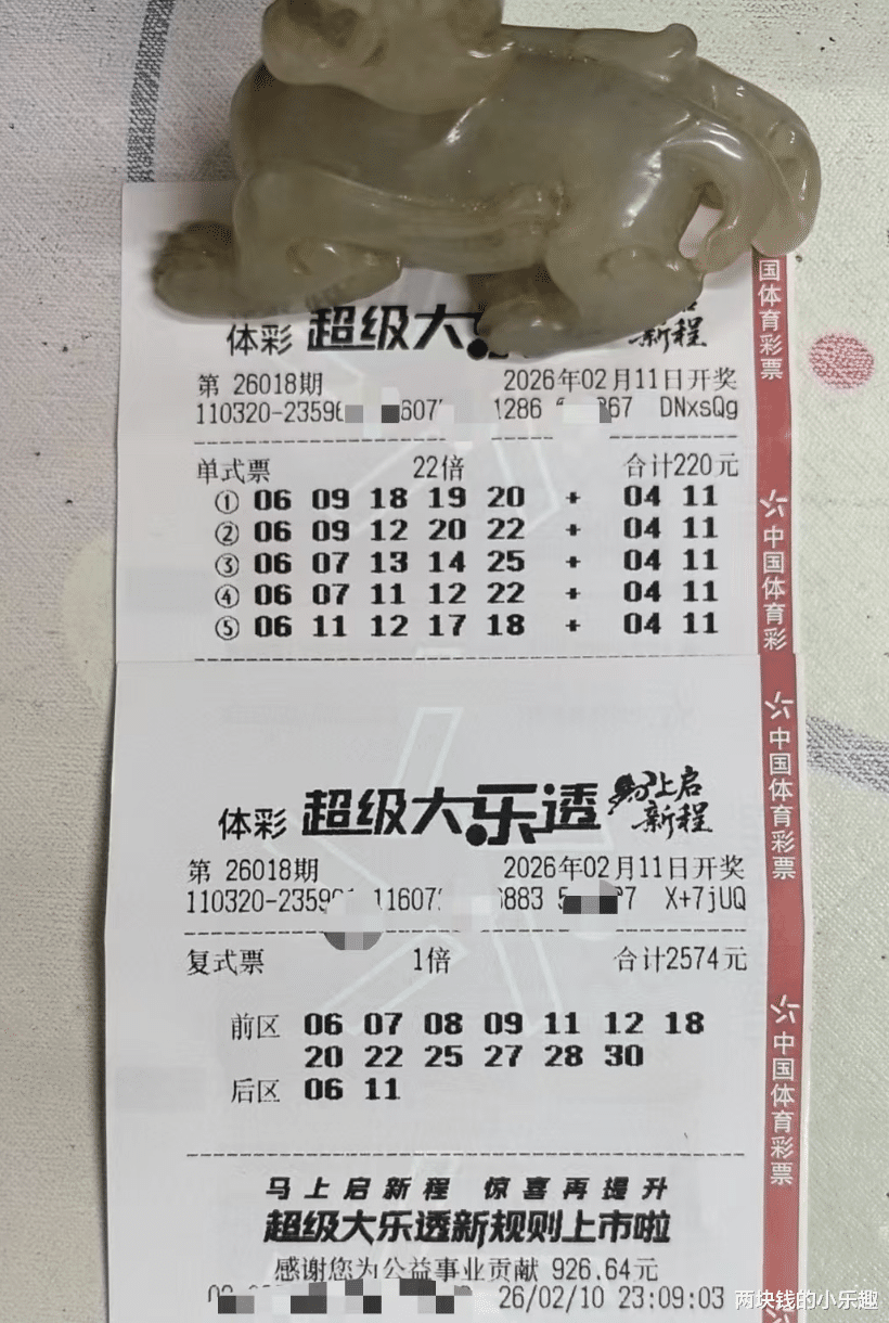以上两张是江苏99倍个贡献的本期精彩内容,第一张自然是大家熟悉的5注22倍,自从执行新规,由99倍改成22倍后,老哥这张风向标般的22倍票始终没有开张,从某种意义来说,新规的确给老哥节省了不少的投入成本,本期老哥选号是比较奇特的,5注的第一位是同一号码06,而且多注号码都融合了连号和断区等姿态,后区圈定一大一小的04 11;第二张是本期13+2的2574复式,和之前不太一样的是,本期复式的后区和22倍票没有选择相同组合,而是圈定了06 11,本期是节前的最后一期了,99倍哥为了自己的美好梦想,依旧是22倍和2574复式一同发起挑战,老哥坚持站好最后一班岗!