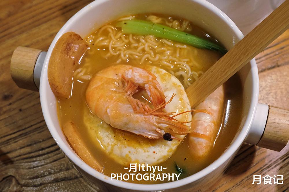 还有野生大虾泡面,虾实在够大,还配有煎蛋和午餐肉。汤头非常鲜,泡面吸饱汤汁,每一口很满足!