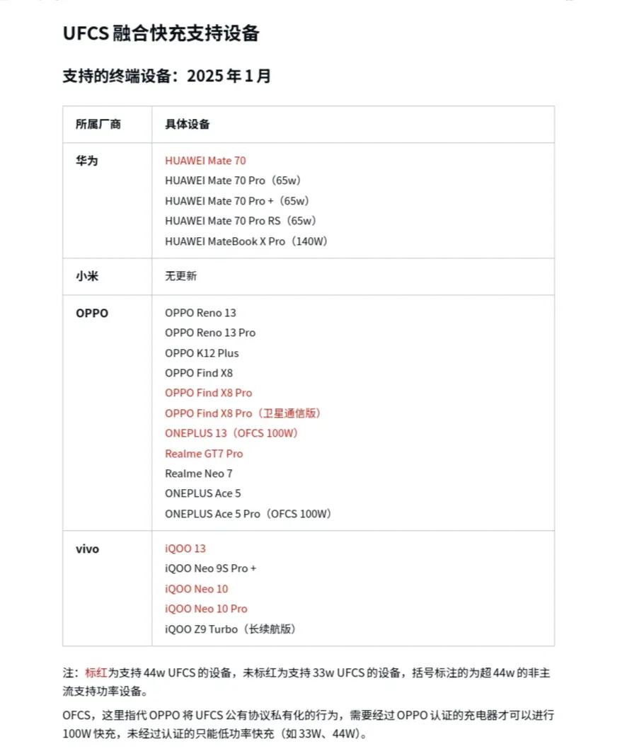 中国主导的统一标准,2025年UFCS 2.0版本将互通功率提升至80W,覆盖华为、小米、OPPO、vivo、荣耀等品牌。