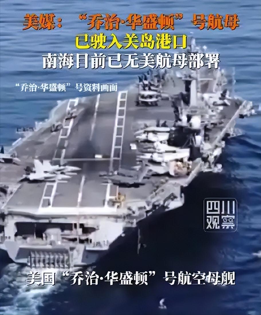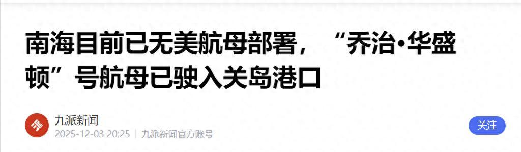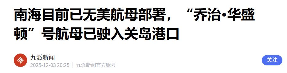 信息来源:《南海目前已无美航母部署,“乔治·华盛顿”号航母已驶入关岛港口》九派新闻2025-12-03 20:25