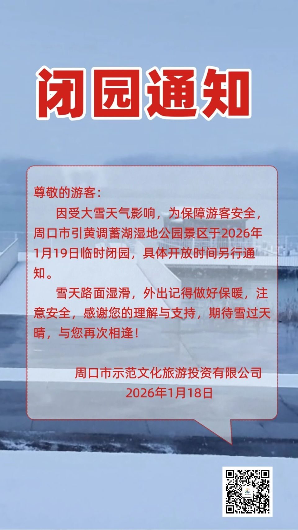 受天气影响 周口多个景区临时闭园 一起来看看吧 ↓↓↓ 周口野生动物世界闭园通告 周口市引黄调蓄湖湿地公园闭园通知 老子