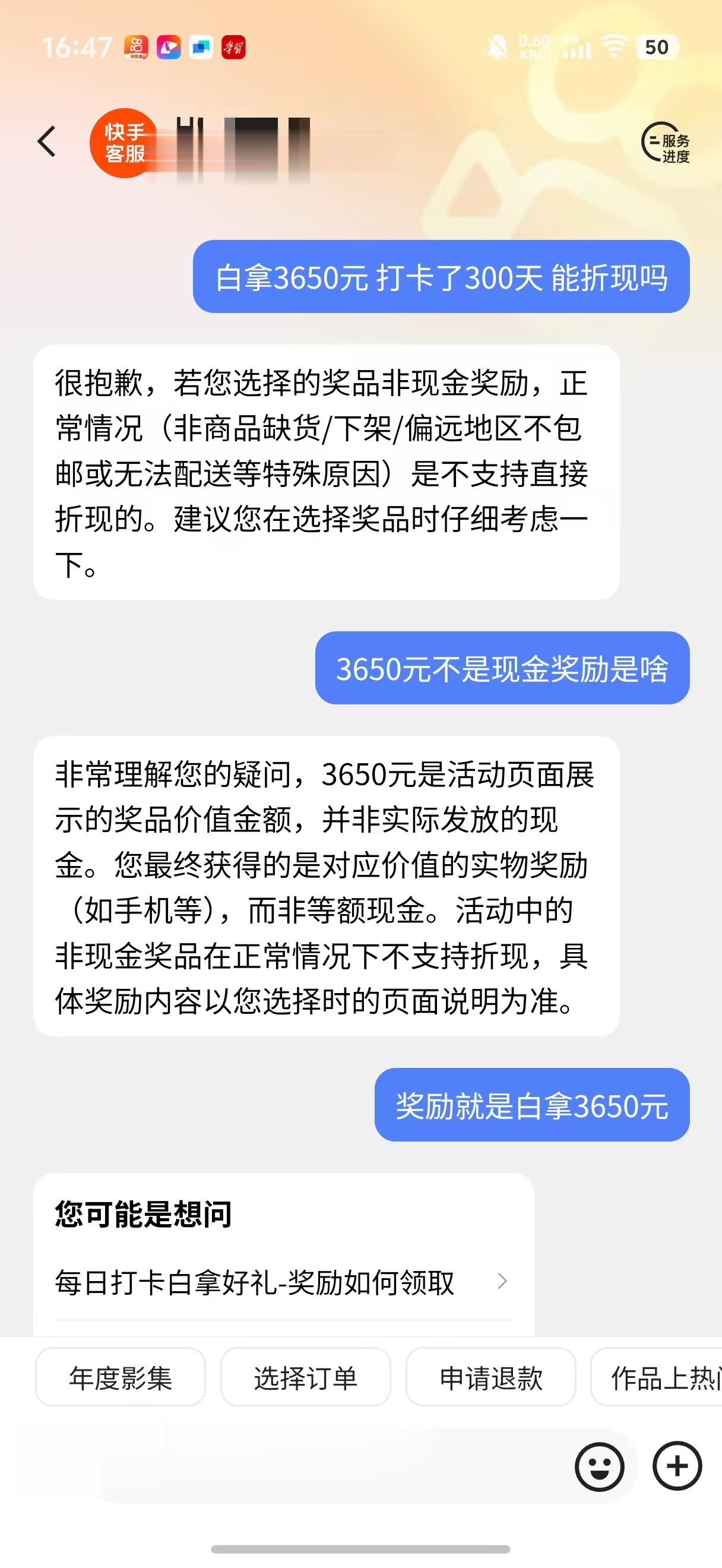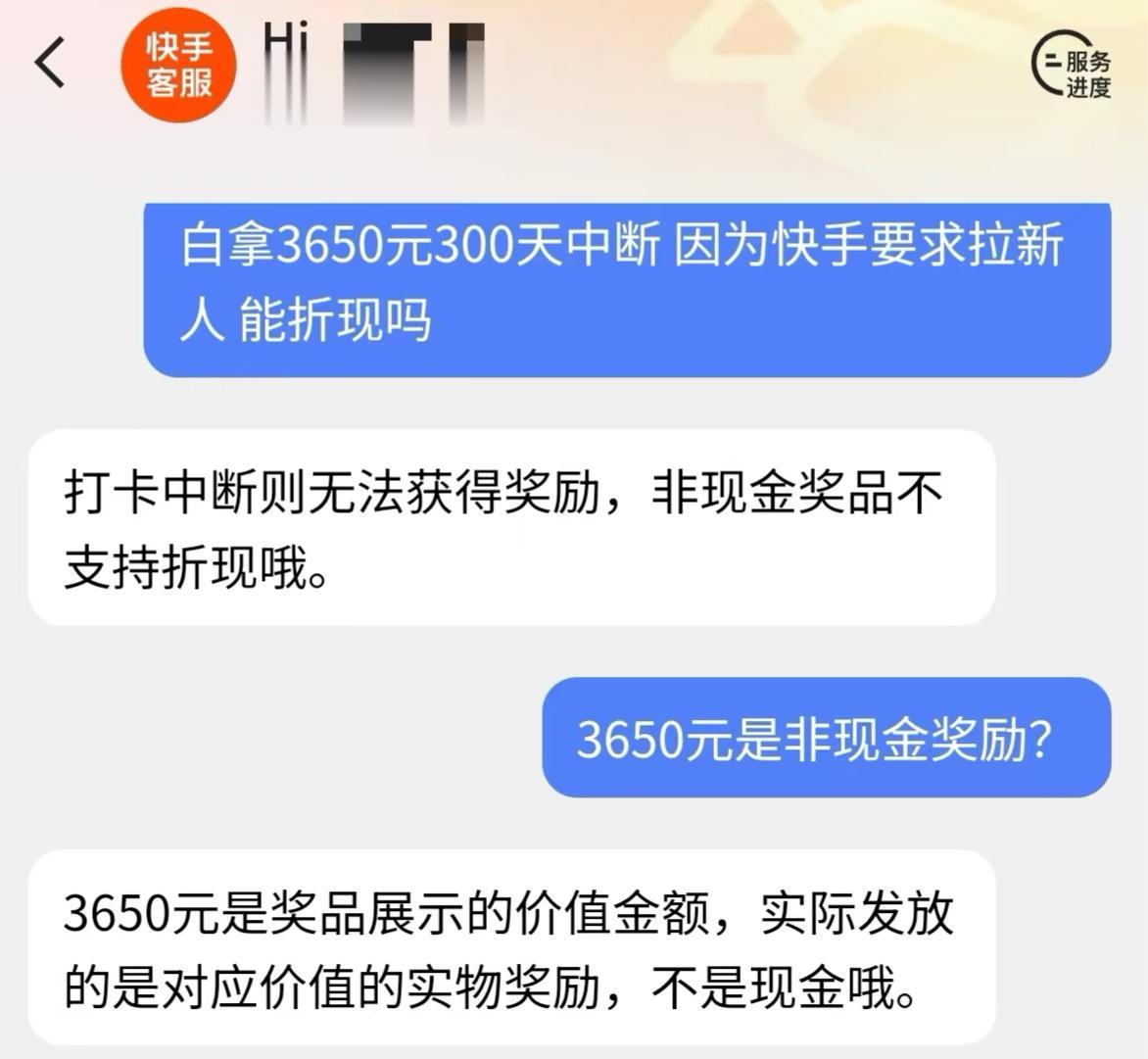 当他提出按累计工时折现补偿时,客服直接拒绝,还透露3650元只是奖品价值,并非现金,最终发放的是对应价值的实物。