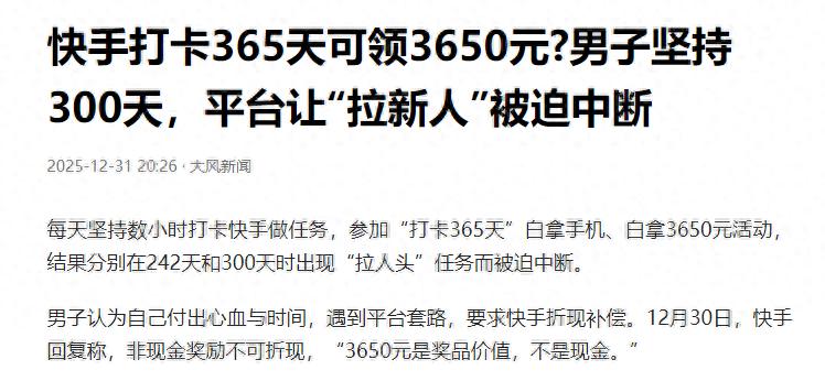 2024年10月,他刷到快手极速版的打卡活动,一个宣称“连续365天领3650元现金”,