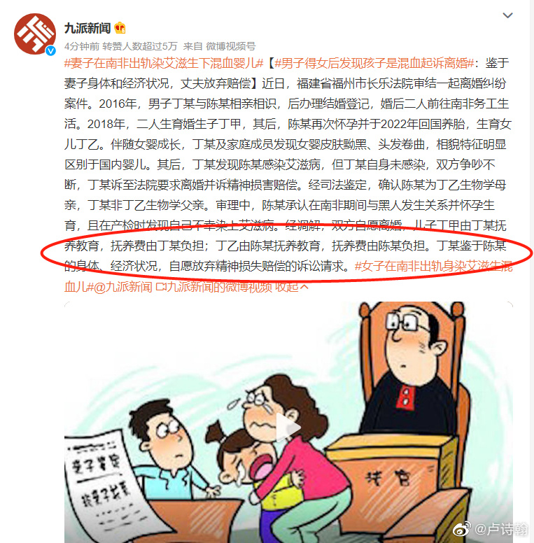 夫妻二人共同去南非务工,妻子红杏出墙,丈夫却丝毫不知。若不是回国后,孩子出生,才有了疑惑,估计丈夫一辈子都不知道妻子外遇的事情。但是妻子也是付出了惨重的代价,感染了艾滋。丈夫虽然不要求精神赔偿,但是属实可怜。不知道哪个混血婴儿,以后的人生该如何走下去?!这个混血孩子,才是最悲惨的!