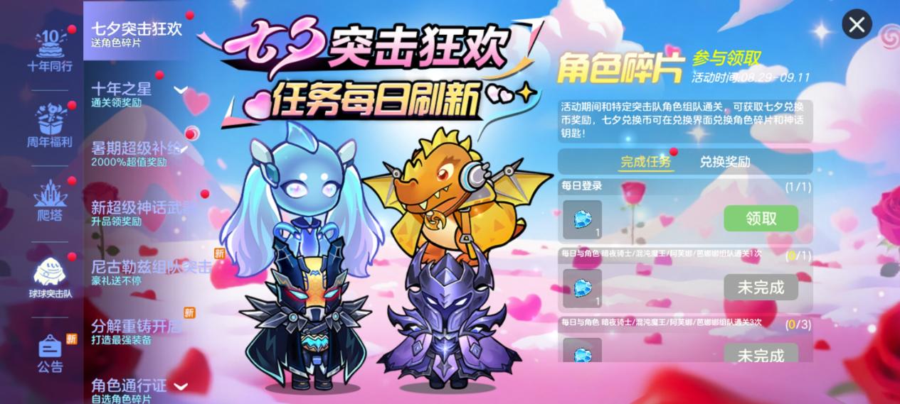 七夕狂欢于8月29日至9月11日正式开启!完成每日任务免费领取七夕兑换币,与好友开黑收集更多兑换币,可兑换「混沌魔王碎片」、「阿芙娜碎片」、「芭娜娜碎片」、「暗夜骑士碎片」、「神话角色钥匙」等珍贵道具!同时限时上架角色的奇迹能量连锁礼包,助力球宝快速解锁新角色开启冒险!