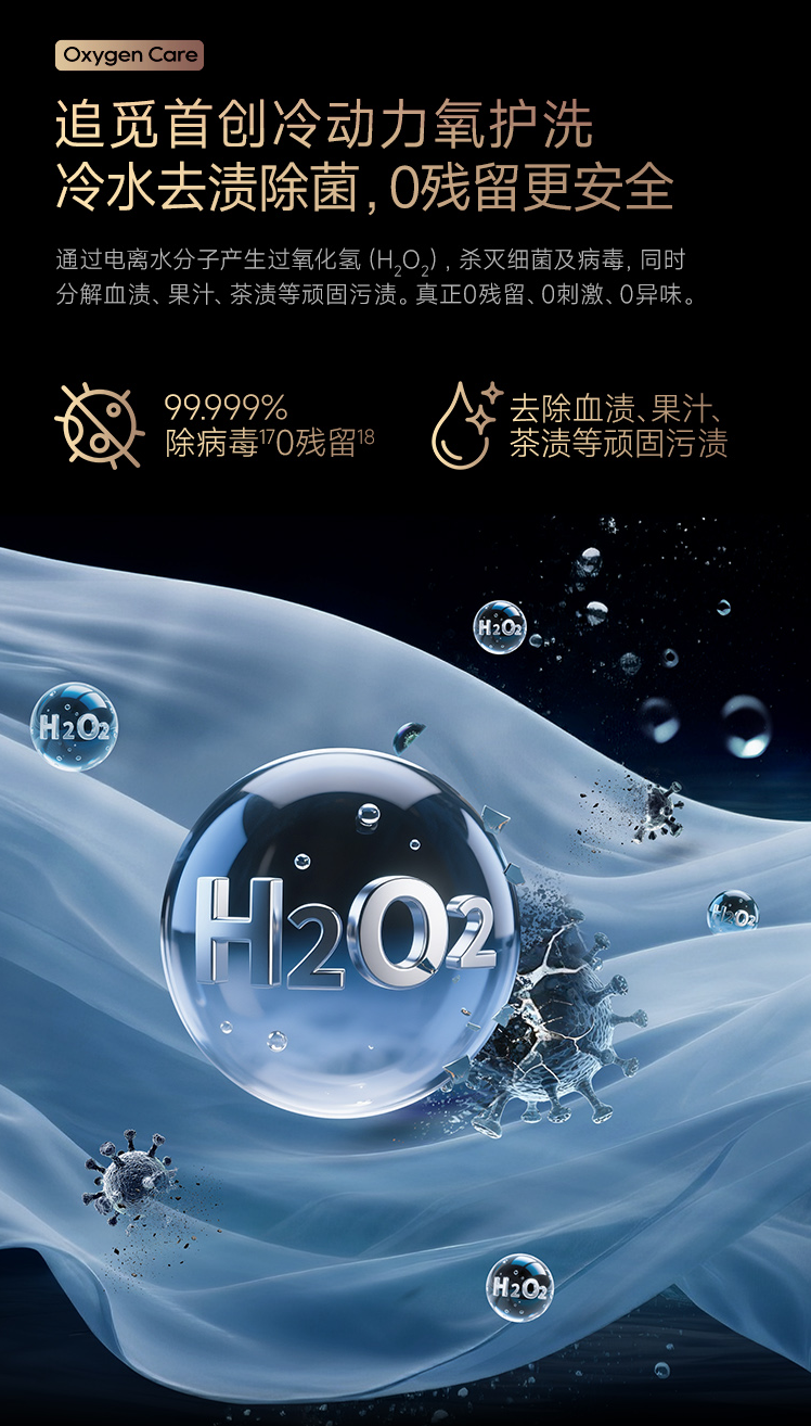这项技术的核心在于电解水。追觅L9洗烘套装通过冷动力氧护系统对水进行电解,在水中生成过氧化氢,强力瓦解油污、软化蛋白污渍,无需高温就能剥离顽固污垢,杀菌率高达99.99%。在洗涤中协同工作,清洁、护衣、杀菌一次完成。全程保持冷水状态,既保证洗净力,又不伤面料。