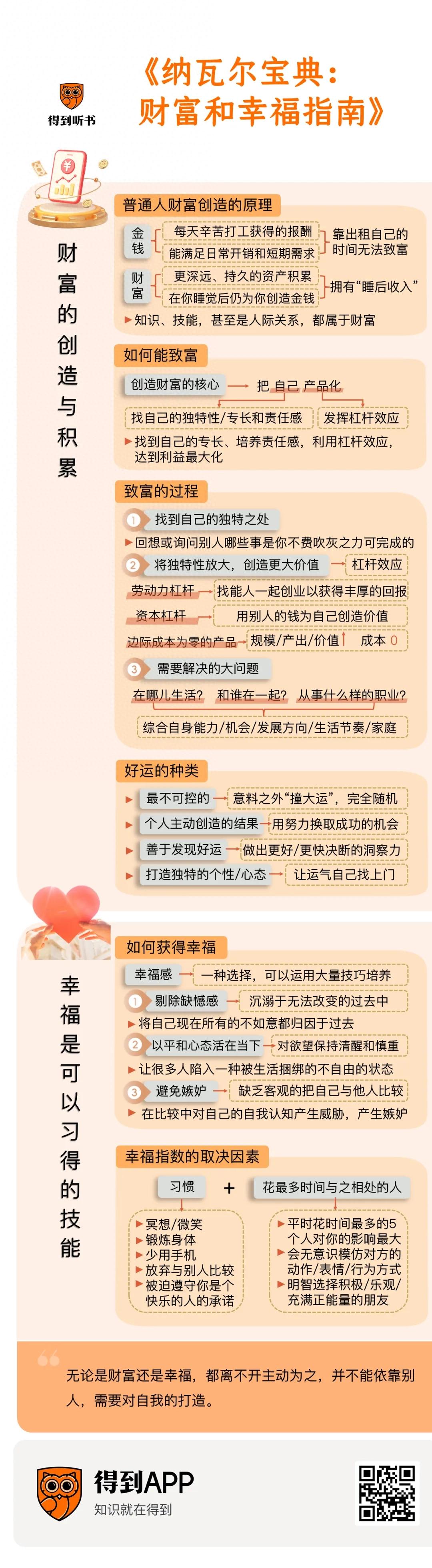 从书的名字就不难看出,这本书包含的两大核心内容:一是解决赚钱的问题,走上财富之路;二是解决快乐的问题,迈入幸福之道。我们今天的内容就从这两部分出发,和你一起看看纳瓦尔的那些有关财富积累和幸福人生的原则与方法。
