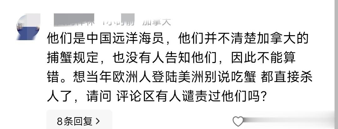 有网友说,中国远洋海员不清楚加拿大捕蟹规定,也没人告知,所以不算错,还拿欧洲人登陆美洲杀人却没被谴责来类比。我觉得这个类比不太恰当,法律和历史不能混为一谈,不懂法不能完全成为免责的理由。
