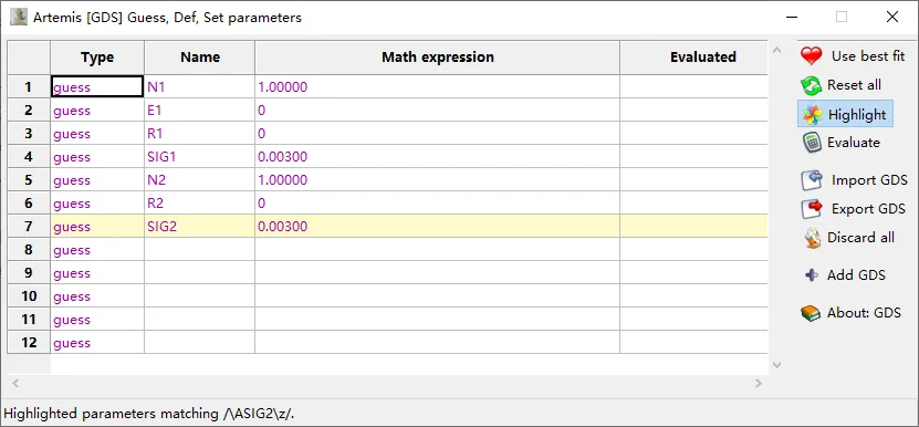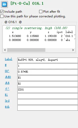 5.对导入的path设置拟合参数,我们将S02固定为0.87(通过foil样品得来),对N、ΔE、ΔR、σ2→命名并guess(小技巧:N是无法命名的只能输入固定值,在固定S02时会需要额外加入N的guess值,可以将其输入至S02命名处,并与S02值相乘,这样拟合结果就会显示N了)