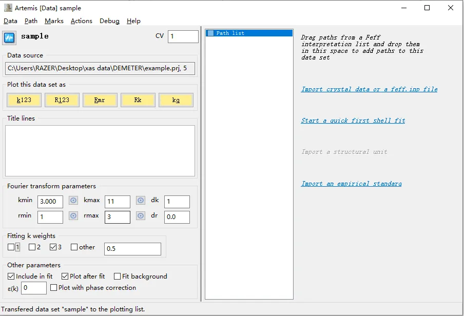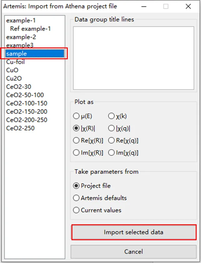 2.导入需要拟合的数据:File →open project or data→选择Athena导出的数据,或者直接点击data set→Add,选择Athena导出的数据。