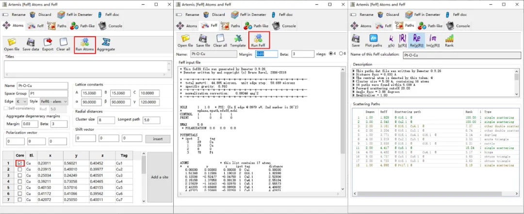 3.导入模型文件,点击Feff calculation→Add,选择模型文件(cif),选择中心原子,点击Run Atoms→Run Feff之后就可以得到拟合使用的path。