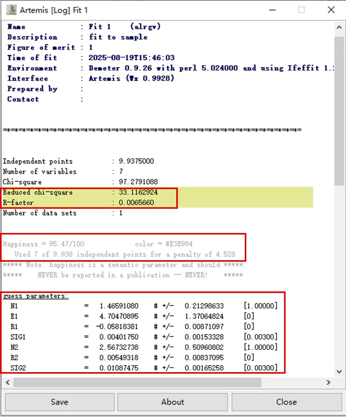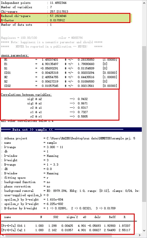 说明:Artemis对XAFS数据拟合是重点也是难点,通过拟合可以得到配位数N、原子间距离R、无序度σ2、振幅衰减因子S02、能量原点的位移ΔE0等结构参数。