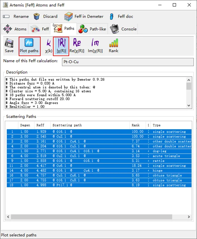 4.对path惊醒一个简单的预览,选中所有path,点击|χ(R)|→Plot paths,得到所有path的预览图,与样品数据进行对比选择合适的path。将使用的path拖入到data窗口。