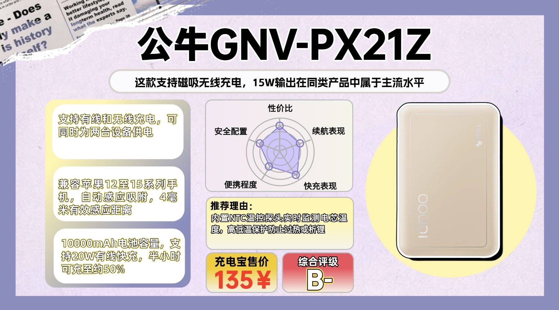 安全层面通过多重认证,用料和做工延续品牌一贯风格。不过容量不算大,且价格在同规格产品中偏高。如果追求高功率快充和品牌稳定性,它的表现比较均衡;若只看容量性价比,选择空间会更多。