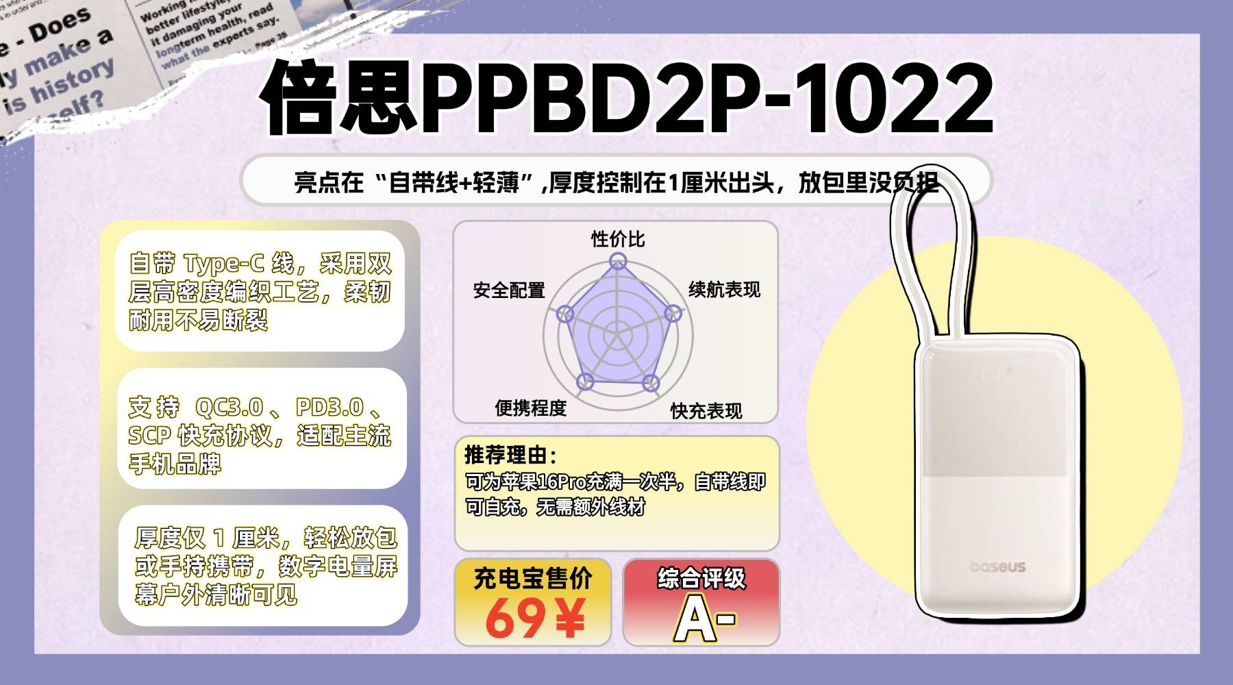 这款的亮点在“自带线+轻薄”。厚度控制在1厘米出头,放包里几乎没负担。机身自带Type-C编织线,线材柔韧度不错,日常弯折没有明显发硬,减少单独带线的麻烦。