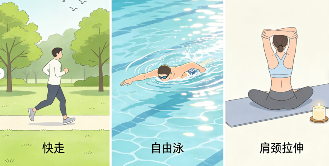 在空气清新的环境中,保持匀速快走或慢跑30分钟左右,能有效放松身心。注意选择平整的路面,避免崎岖山路增加颈椎负担。运动前后要充分补水,避免脱水诱发头痛。