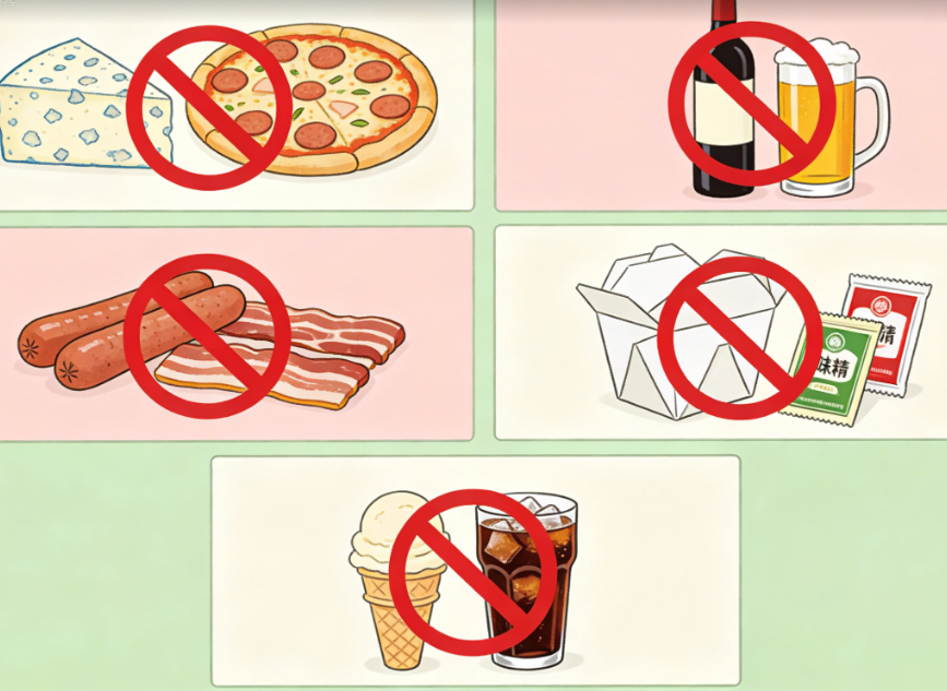 哪些食物含酪胺高?主要有:陈年的奶酪(比如蓝纹奶酪、帕尔玛奶酪)、发酵食品(泡菜、酸菜、酱油)、腌制肉类(香肠、培根、腊肉)。如果你发现每次吃完披萨(上面有大量奶酪)后头痛发作,很可能就是酪胺在作怪。