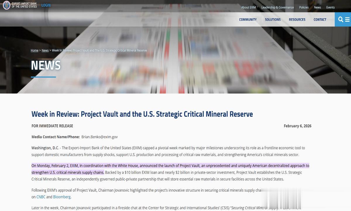 2026年2月6日,美国进出口银行(Export-Import Bank of the United States,EXIM)在其官网的一周回顾中刊发了“金库计划与美国战略性关键矿产储备”一文,介绍了“金库计划”的有关情况,以下为这篇文章的主要内容: