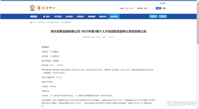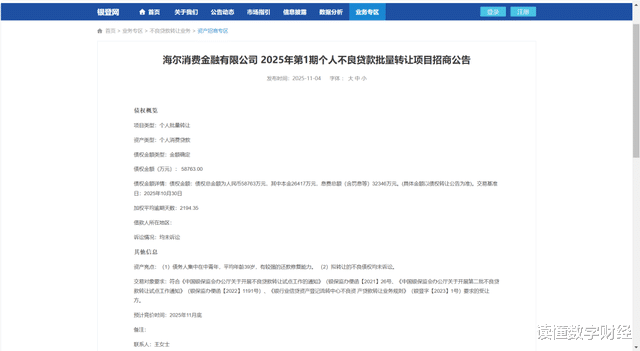 近日,海尔消费金融于银行业信贷资产登记流转中心连发3期个人不良贷款批量转让项目招商公告,总金额近15亿元。