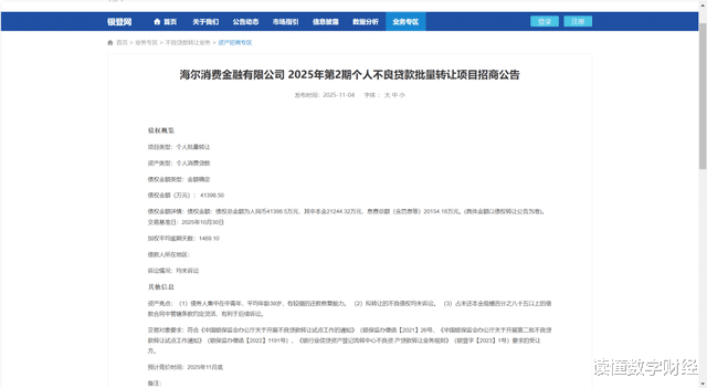 公告显示,债权金额分别为5.88亿元、4.14亿元、4.37亿元,加权平均逾期天数2194.35天、1469.1天、1071.25天。债务人集中在中青年,第一期、第二期平均年龄39岁,转让的不良债权均为诉讼,预计竞价时间2025年11月底。此次为本年度海尔消费金融在银行业信贷资产流转中心首次登记转让债权。