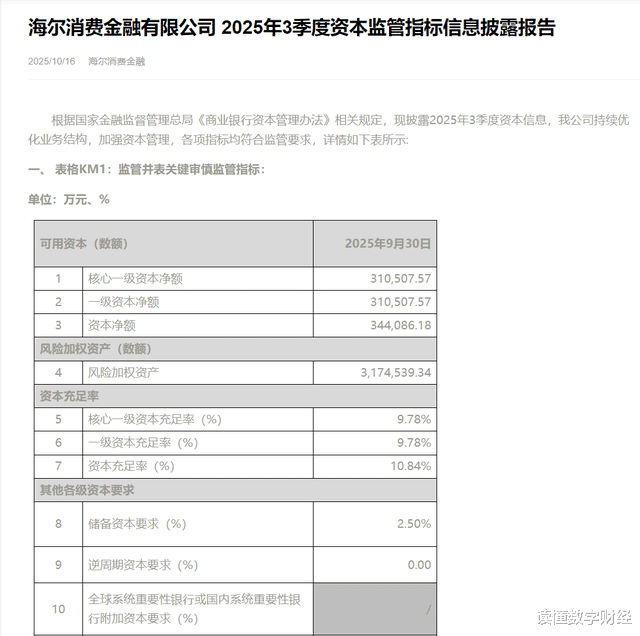 海尔消费金融官网发布的2025年3季度资本监管指标披露信息显示:截至本年9月末,其资本净额为34.41亿元,核心一级资本充足率为 9.78%,一级资本充足率9.78%,资本充足率为 10.84%。